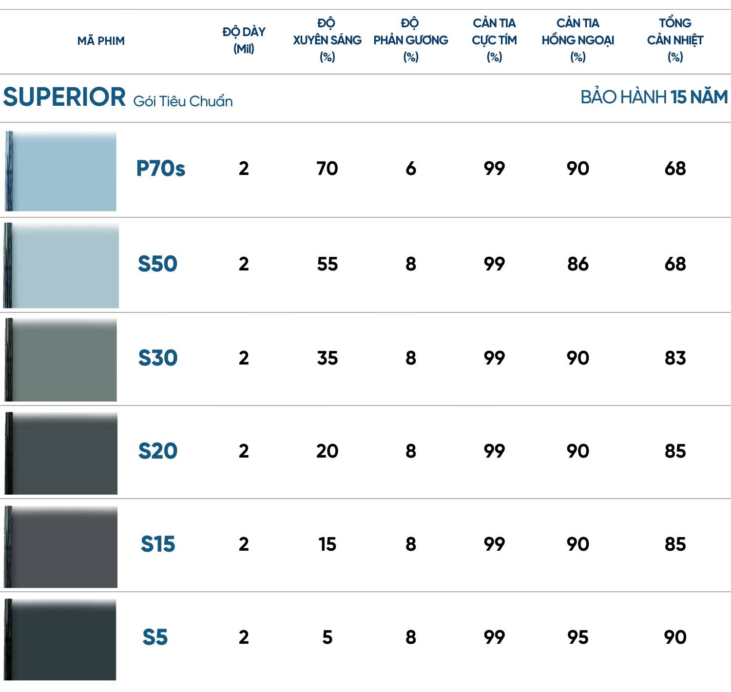 Truyền sáng tốt: Mã phim kính lái S50 có tỷ lệ xuyên sáng là 55%. Độ truyền sáng này đã được tinh tế cân chỉnh nhằm đảm bảo mang lại sự cân bằng lý tưởng giữa các yếu tố: khả năng quan sát, giảm chói lóa và hiệu quả chống nóng.