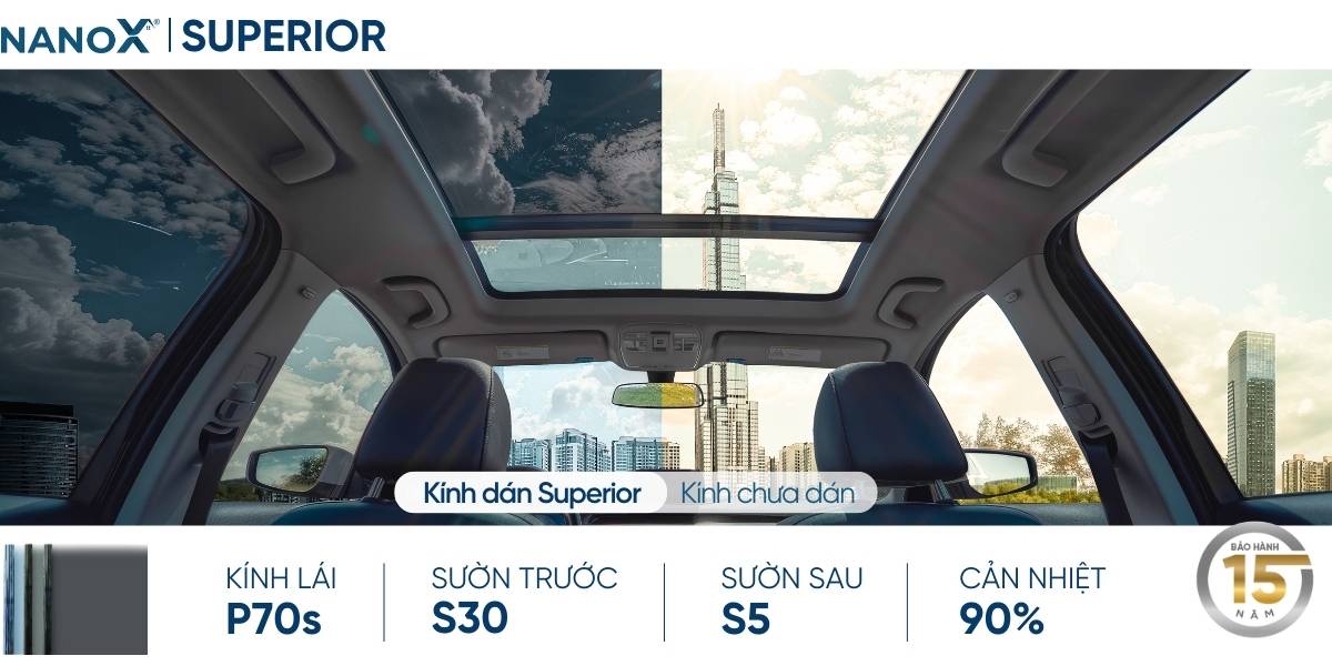Gói phim cách nhiệt ô tô 4,5 chỗ NanoX Superior sản xuất bằng công nghệ Nano Ceramic X-Shield, đạt khả năng cản nhiệt cao. Những mã phim trong gói Superior sở hữu màu sắc tự nhiên, với đa dạng mức độ truyền sáng khác nhau.